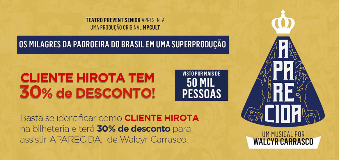 Uma história emocionante de fé indicada para pessoas de todas as religiosidades, APARECIDA, com texto de Walcyr Carrasco e direção de Fernanda Chamma. O espetáculo tem música original e direção musical de Carlos Bauzys, letras originais de Ricardo Severo, cenografia de Richard Luiz, figurinos de Fábio Namatame, desenho de luz de César de Ramires, desenho de som de Gabriel D’Angelo e produção da MPCult.