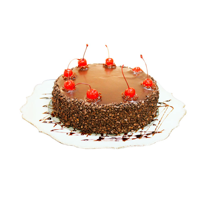 Pão de ló de chocolate recheado com um delicioso creme de brigadeiro, envolto por flocos granulados sabor meio amargo, coberto com doce de leite com chocolate e cerejas inteiras.