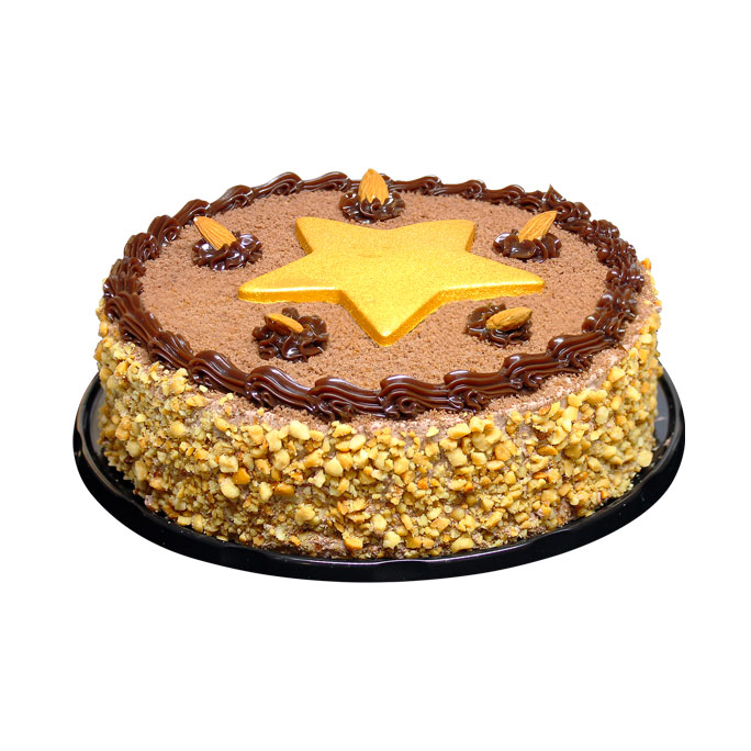 Pão de ló de chocolate recheado com um delicioso mousse de chocolate com amêndoas, envolto com xerém de amendoim, decorado com farelo de pão de ló de chocolate, amêndoas inteiras e uma linda estrela dourada.