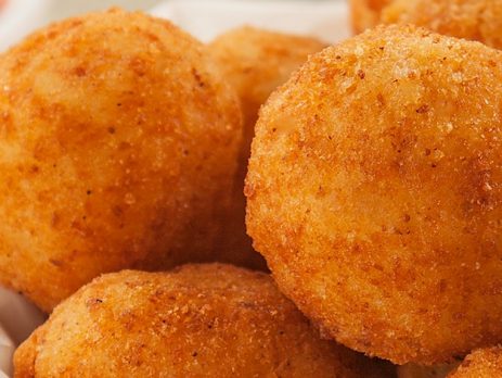 Arancini de fondue de queijo com molho de tomate picante e manjericão