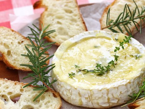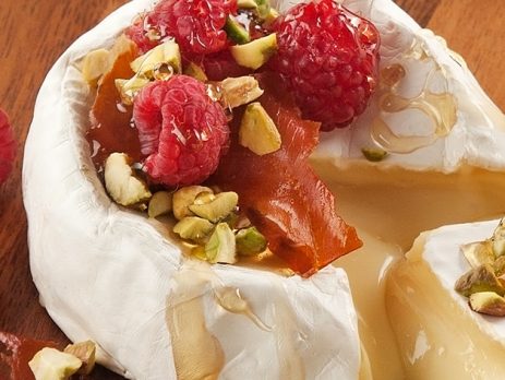 Queijo Camembert Aquecido com Chips de Presunto Cru, Framboesa Fresca, Mel e Farofinha de Pistache