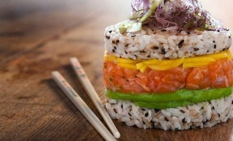 Sushi Burger de salmão com molho TARÊ KIKKOMAN, acompanhado de MOLHO DE WASABI KIKKOMAN