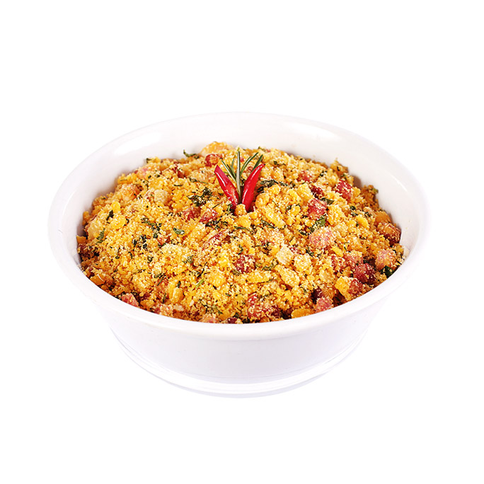 Tradicional massa de cuscuz elaborada com frango desfiado, palmito, tomate cereja, ovos cozidos, ervilhas frescas e pimentões.