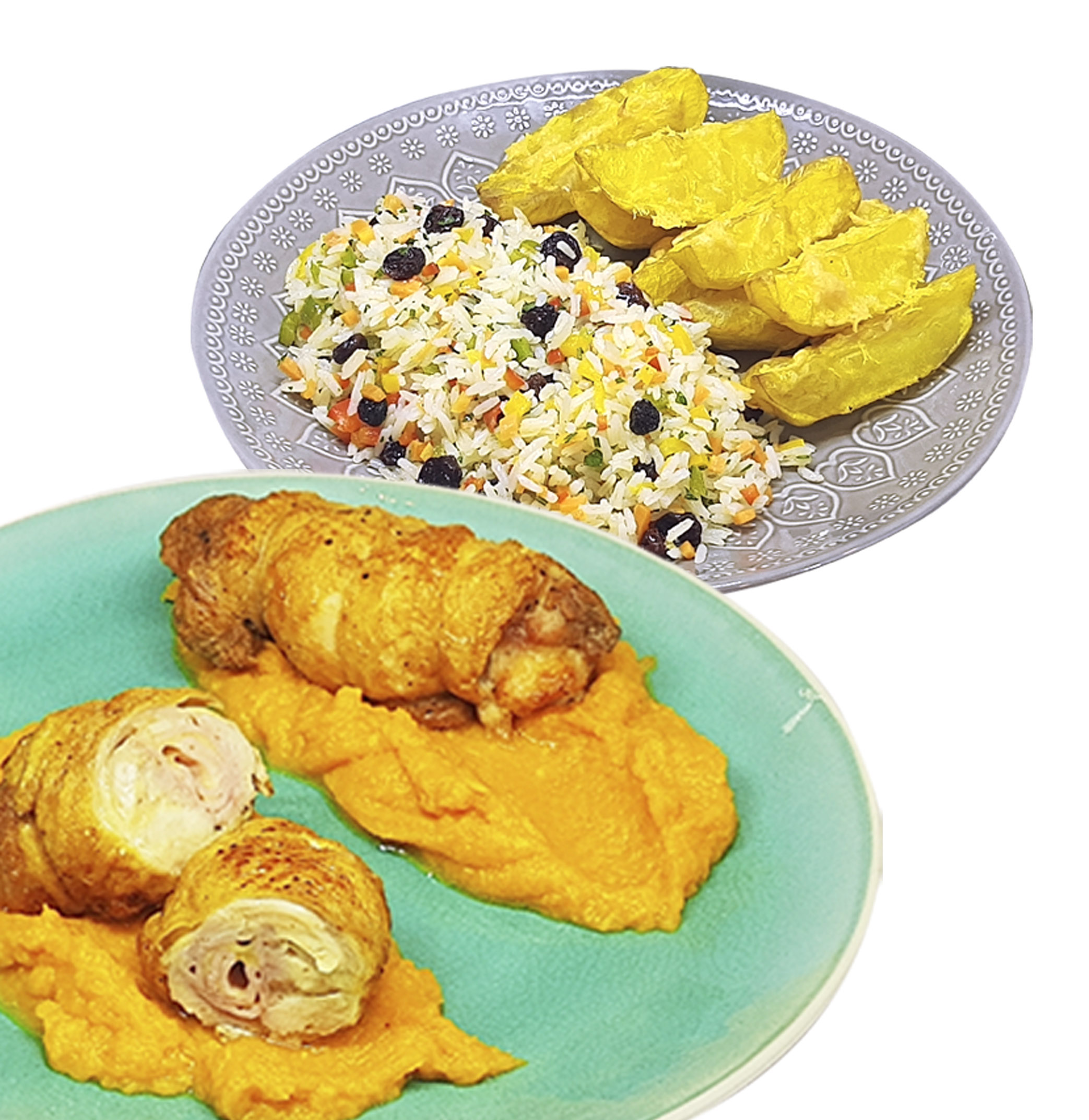 Kit Filé de Sobrecoxa Recheada com purê de abobóra, arroz à grega e batatas coradas // R$ 39,90