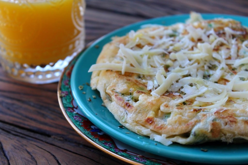 Em um recipiente, misture todos os ingredientes. Aqueça uma frigideira com azeite e despeje metade da massa. Doure de um lado e depois do outro. Retire da frigideira, polvilhe mais queijo e sirva.