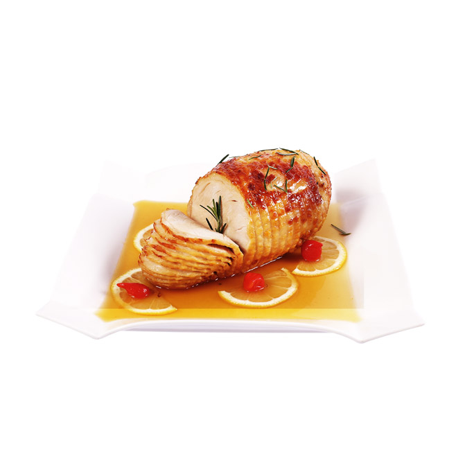 Pernil marinado por 24 horas e assado lentamente até dourar por completo, guarnecido com frutas e molho madeira.