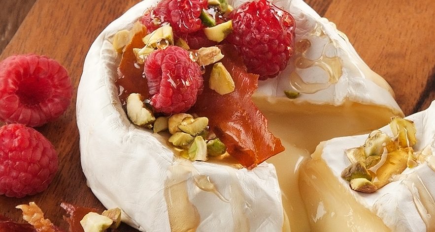Queijo Camembert Aquecido com Chips de Presunto Cru, Framboesa Fresca, Mel e Farofinha de Pistache