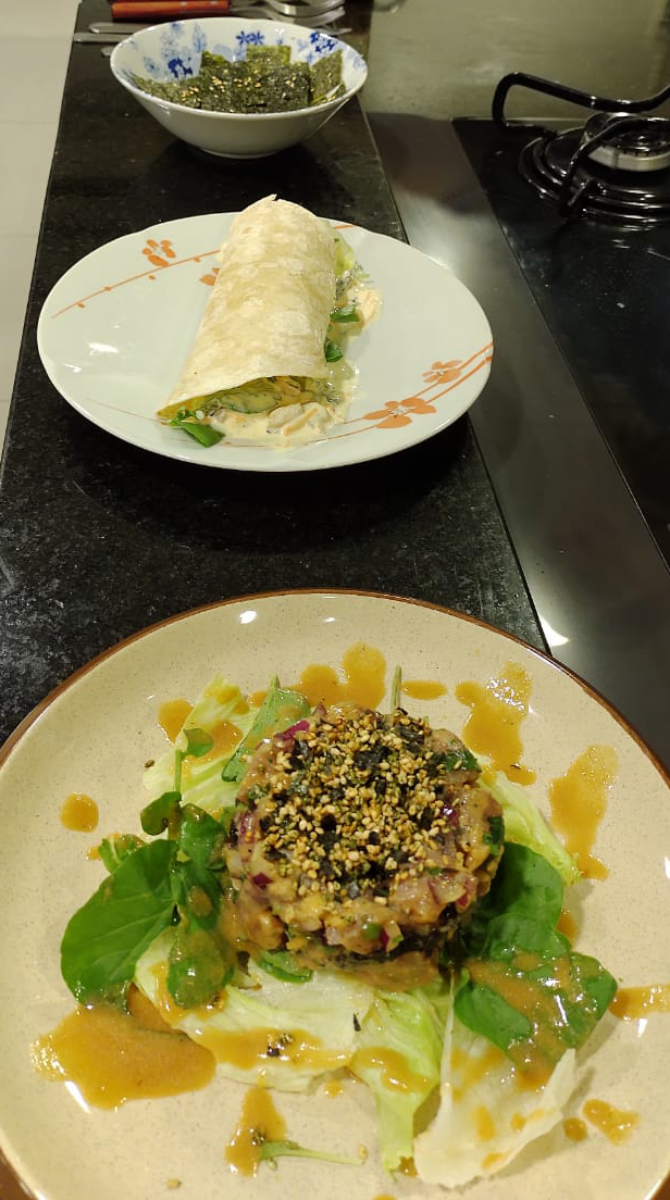 - Tartar de atum com furikake e nori acompanhado de salada de folhas ao molho de missô