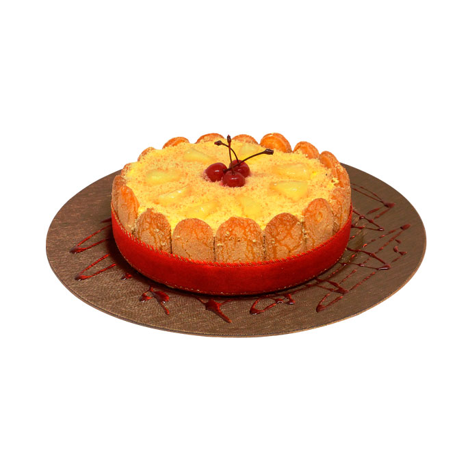 Fina camada de pão de ló branco, com creme de abacaxi decorado com farofa de pão de ló, cerejas e pedaços de abacaxi, envolto com bolacha champagne.